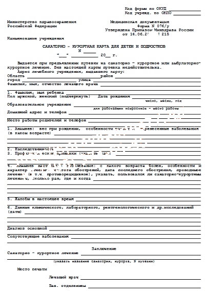 Форма 076/у представляет собой санитарно-курортную карту, которая потребуется детям и взрослым для прохождения лечения в соответствующих оздоровительных учреждениях. При наличии путевки на лечение в санитарно-курортных учреждениях получить данный документ можно через участкового педиатра. Процесс оформления справки 076/у требует прохождения различных специалистов и сдачи нескольких анализов, поэтому быстро получить ее в течение одного дня нельзя. Для ребенка это особенно важно, так как природные и климатические факторы в назначенном лечении могут повлиять на организм отрицательно.
